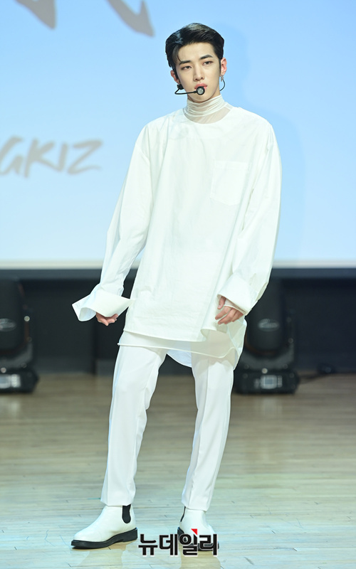 아이돌그룹 동키즈(Dongkiz) 재찬이 19일 오후 서울 강남구 일지아트홀에서 열린 3번째 미니앨범 '자아(自我)' 쇼케이스에서 포토타임을 갖고 있다.