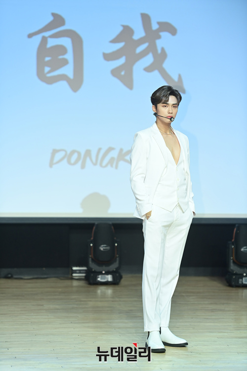 아이돌그룹 동키즈(Dongkiz) 경윤이 19일 오후 서울 강남구 일지아트홀에서 열린 3번째 미니앨범 '자아(自我)' 쇼케이스에서 포토타임을 갖고 있다.