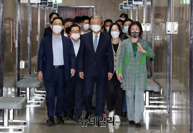 김종인 미래통합당 비상대책위원장, 주호영 원내대표 등 지도부가 20일 오전 국회에서 열린 비상대책위원회 회의에 참석하기 위해 입장하고 있다.