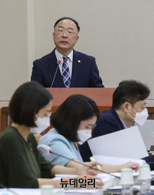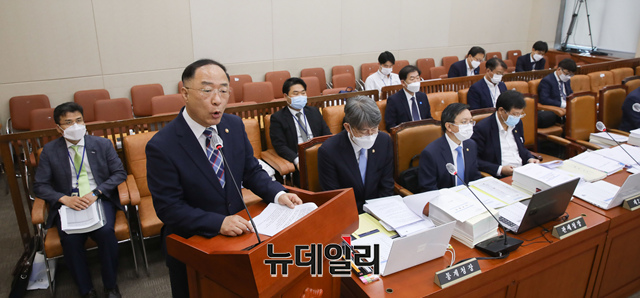 홍남기 경제부총리 겸 기획재정부 장관이 20일 오전 국회에서 열린 기획재정위원회 전체회의에서 업무보고를 하고 있다.