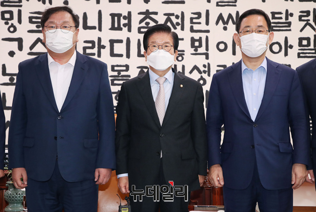 [포토] 한자리에 모인 박병석 국회의장과 여야 원내대표