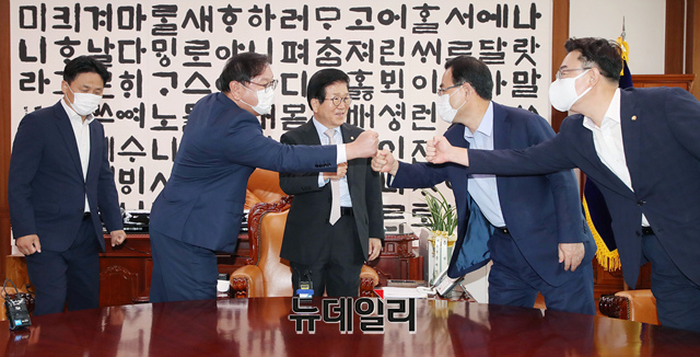 박병석 국회의장과 여야 원내지도부가 20일 오전 국회에서 국회의장-여·야 원내대표 회동을 갖고 있다. (왼쪽부터 김태년 더불어민주당 원내대표, 박병석 국회의장, 주호영 미래통합당 원내대표)