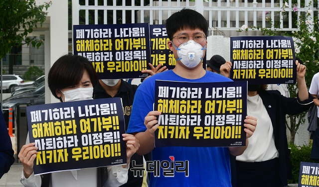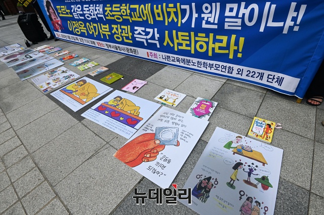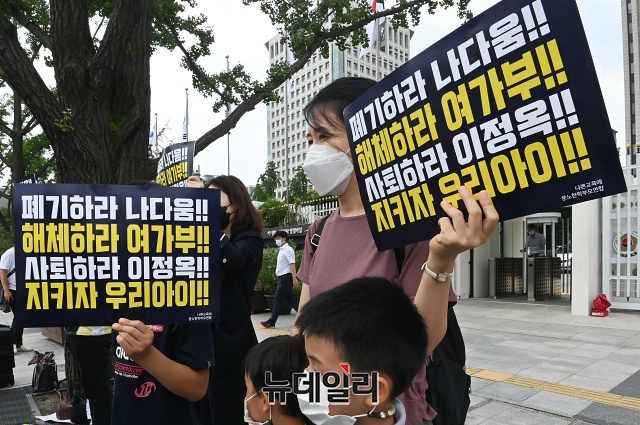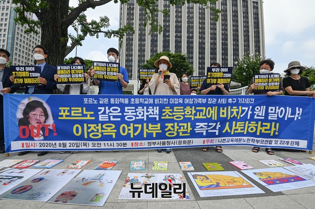시민단체 나쁜교육에분노한학부모연합이 20일 오전 서울 종로구 정부서울청사 앞에서 '이정옥 여가부 장관 사퇴 촉구 기자회견'을 갖고 있다.이들은 "여성가족부가 추진한 '나다움 어린이책 선정 배포 정책'에서 선정 도서 일부가 지나치게 외설적인 내용과 반사회적인 내용의 책이 선정되었다"고 했다.이어 "교육의 질 저하와 하향평준화를 유도하는 어떤 시도에 대해서도 단호히 대처할 것이며, 이런 잘못된 인식을 바탕에 둔 어떠한 교육정책도 강력히 반대한다"고 밝혔다.이어 △나다움 어린이책으로 선정된 문제의 책 선정 제외 △이정옥 여성가족부 장관 사퇴 △여성가족부 해체 등을 요구했다.