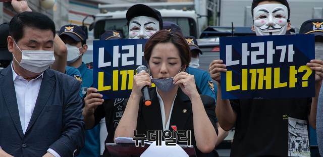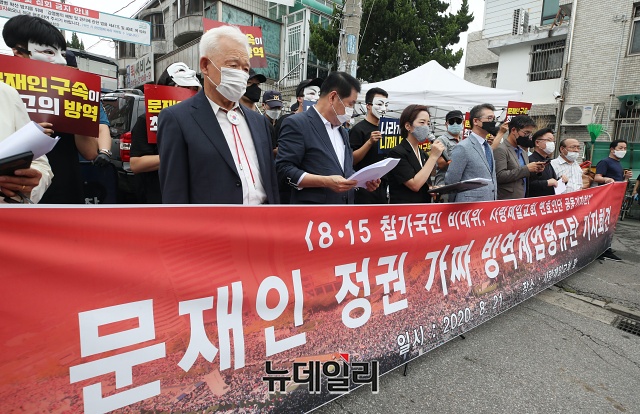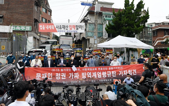 강연재 변호사가 21일 오전 서울 성북구 사랑제일교회 앞에서 열린 '문재인 정권 가짜 방역계엄령 규탄 기자회견'에서 발언하고 있다.강 변호사는 "15회에 걸쳐 이메일로 교인 명단을 모두 제출했다"며 "그래도 서울시는 막무가내로 교회 진입을 요구했고, 이를 거부하자 경찰을 통해 진입 시도를 했다"고 말했다.이어 "서정협 서울시장 직무대행을 폭력행위 처벌에 관한 위반으로 고소하겠다"며 "추가로 불법점거, 사유재산 침입으로도 고소할 예정"이라고 밝혔다.