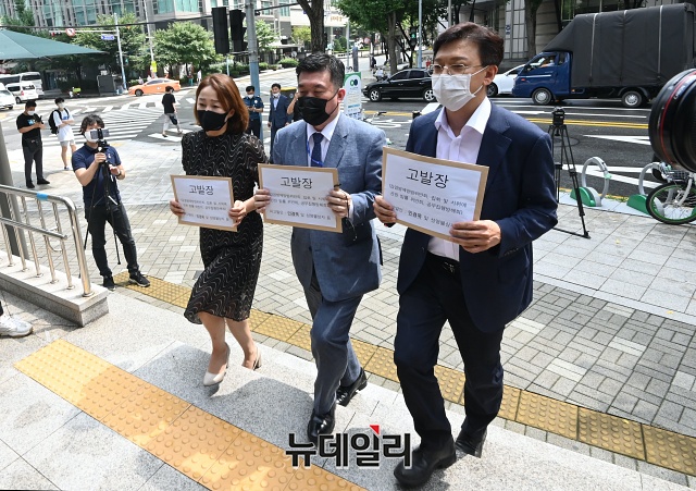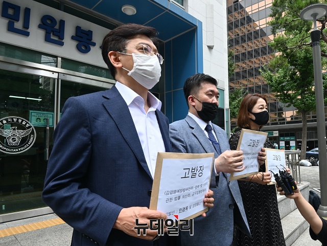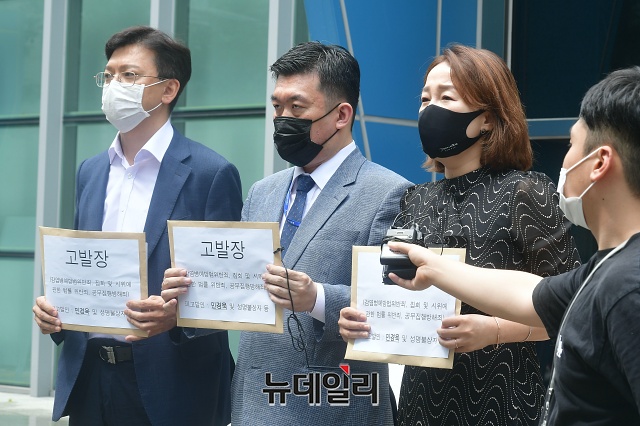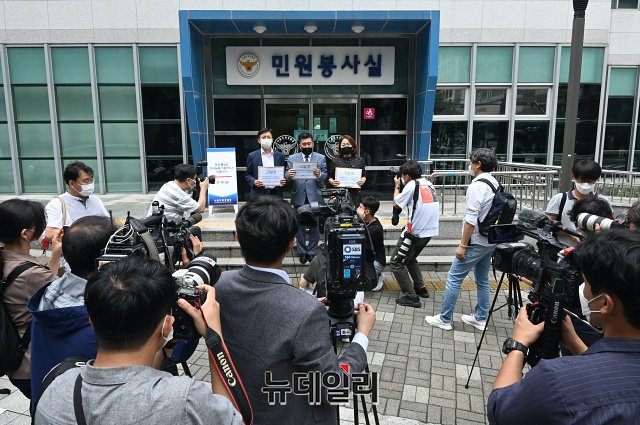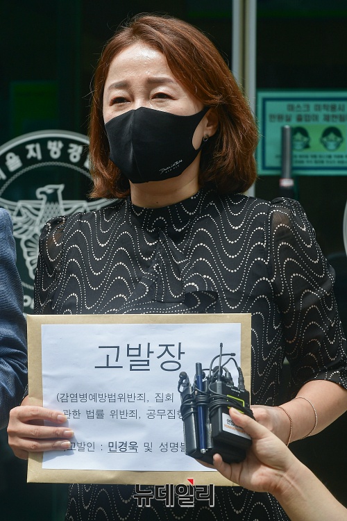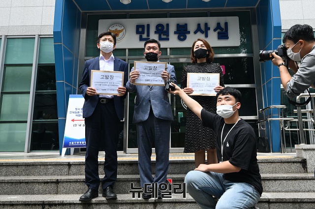 이재정 더불어민주당 의원과 현근택 대변인이 21일 오후 서울 종로구 서울지방경찰청 앞에서 8.15 광화문 집회 주최측 고발 기자회견을 하고 있다. 회견에는 박주민 의원도 참석 예정이 였으나 이날 오전 박 의원 캠프에서 불참을 통보했다.이들은 "코로나19 감염 확산으로 매우 엄중한 상황임에도, 정부의 조치와 국민적 협력을 비웃기라도 하듯 집회를 강행한 피고발인들을 엄벌에 처해야 한다"며 민경욱 전 미래통합당 의원, 민중홍 태극기혁명운동본부 사무총장 등을 감염병예방법 위반, 집회 및 시위에 관한 법률 위반, 공부집행방해죄로 고발했다.