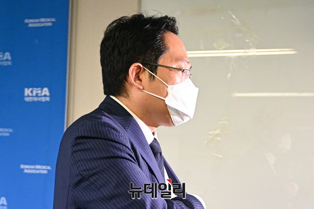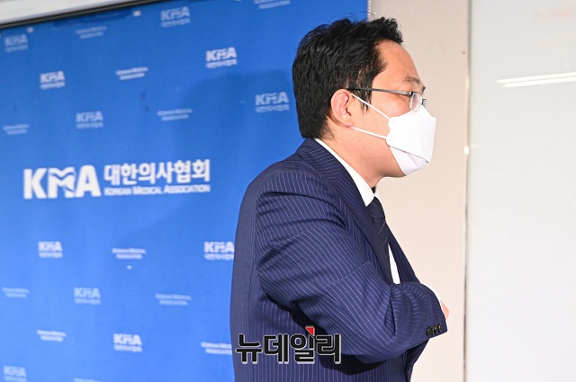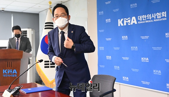 최대집 대한의사협회 회장이 21일 오후 서울 용산구 삼구빌딩에서 열린 긴급 기자회견을 마치고 퇴장하고 있다.