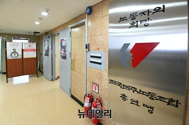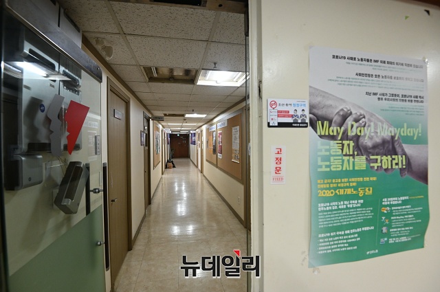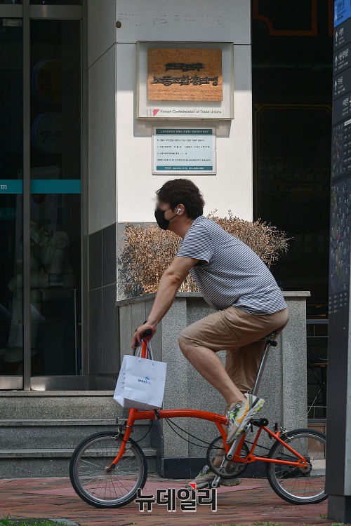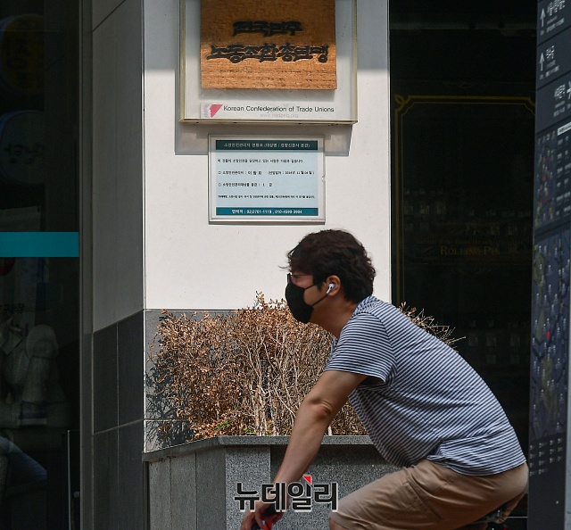 한 시민이 24일 오후 서울 중구 민주노총 사무실 앞을 지나가고 있다.