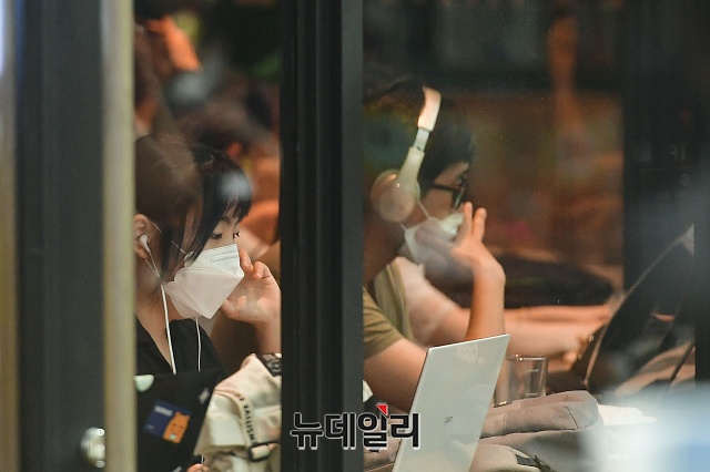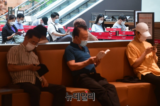 서울 강남구 코엑스 별마당도서관을 방문한 시민들이 24일 오후 거리를 두며 책을 보고 있다.서울시는 '코로나19(중국 우한 폐렴)' 재확산을 막기 위해 24일부터 서울 전역에 마스크 착용 의무화 행정명령을 내렸다. 음식물 먹을 때 등 불가피한 경우를 제외하고 실내·외에서 마스크를 의무적으로 착용해야 한다.위반 시 10월 13일부터(12일까지 계도기간) 과태료 10만원이 부과된다.