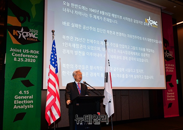고영주 한국보수연합 의장이 25일 오전 서울 용산구 그랜드하얏트 호텔에서 열린 'KCPAC 2020(한·미보수연합대회)'에서 인사말을 하고 있다.