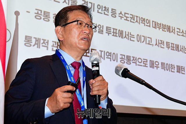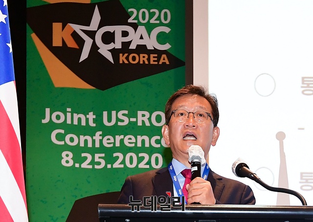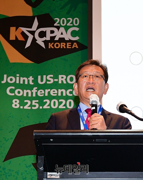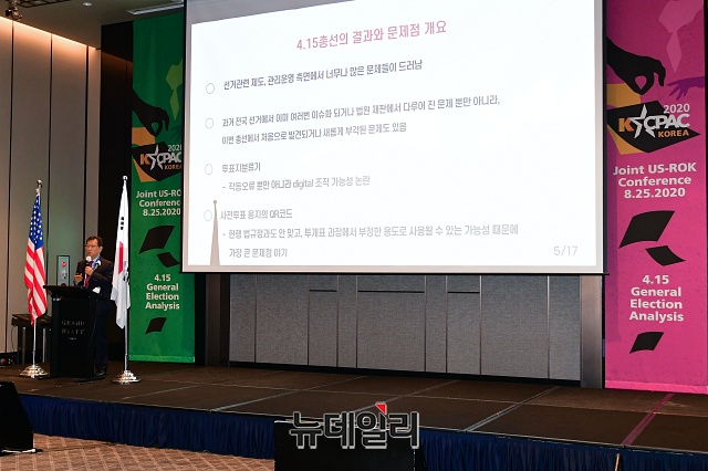 석동현 전 서울동부지검장이 25일 오전 서울 용산구 그랜드하얏트 호텔에서 열린 'KCPAC 2020(한·미보수연합대회)'에서 '4.15 총선 결과와 문제점 개요'를 주제로 발표하고 있다.이번 대회는 '코로나19(중국 우한 폐렴)' 확산으로 무관중으로 진행된다. 고든 창, 타라 오를 비롯한 미국연사는 미국 현지에서 영상을 통해 메시지를 전달한다.KCPAC은 좌파 중심적 철학과 정책으로 자유민주주의 체제의 근간을 흔드는 현 정부를 제어하기 위해 2019년 처음 개최됐다.