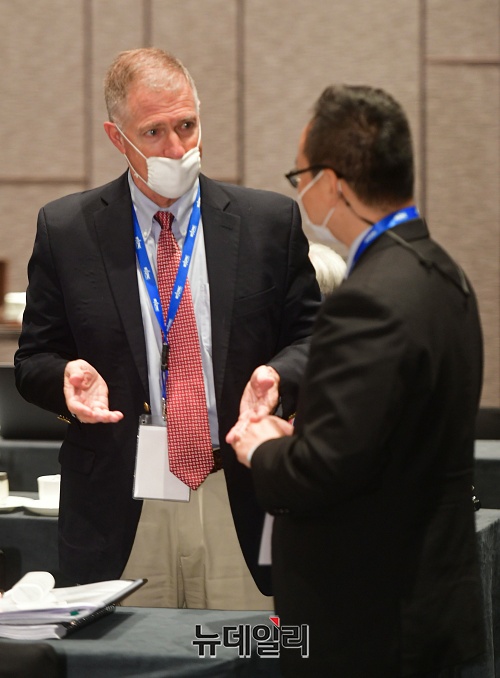 그랜트 뉴솀 안보정책센터 선임연구원, 김은구 서울대 트루스포럼 대표가 25일 오전 서울 용산구 그랜드하얏트 호텔에서 열린 'KCPAC 2020(한·미보수연합대회)'에서 대화를 나누고 있다.이번 대회는 '코로나19(중국 우한 폐렴)' 확산으로 무관중으로 진행됐다. 고든 창, 타라 오를 비롯한 미국연사는 미국 현지에서 영상을 통해 메시지를 전달했다.KCPAC은 좌파 중심적 철학과 정책으로 자유민주주의 체제의 근간을 흔드는 현 정부를 제어하기 위해 2019년 처음 개최됐다.