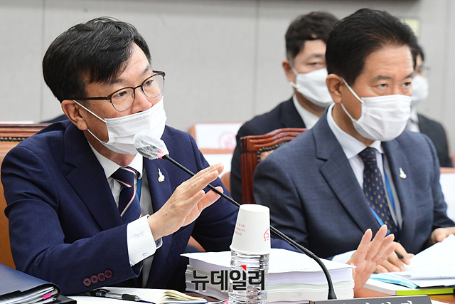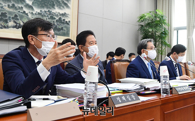 김상조 청와대 정책실장이 25일 오후 국회에서 열린 운영위원회 전체회의에서 의원들의 질의에 답하고 있다.