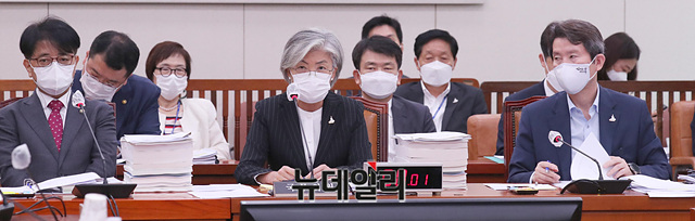 강경화 외교부 장관이 25일 오전 국회에서 열린 외교통일위원회 전체회의에서 업무보고를 하고 있다.