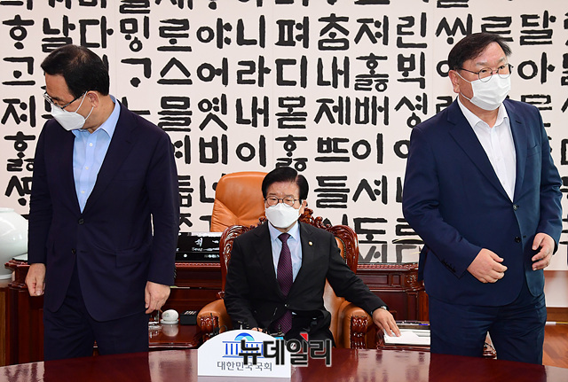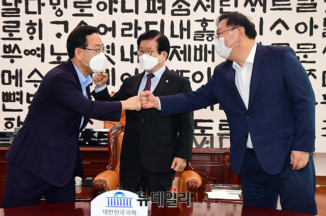 박병석 국회의장이 26일 오전 국회에서 열린 '국회의장-교섭단체 원내대표 정례회동'에 참석해 김태년 더불어민주당 원내대표, 주호영 미래통합당 원내대표와 기념촬영을 하고 있다.