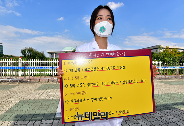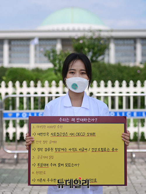 제2차 전국의사총파업 첫째날인 26일 오전 국회의사당 정문 앞에서 한 전공의가 총파업 이유가 적힌 손피켓을 들고 1인 릴레이 시위를 하고 있다.