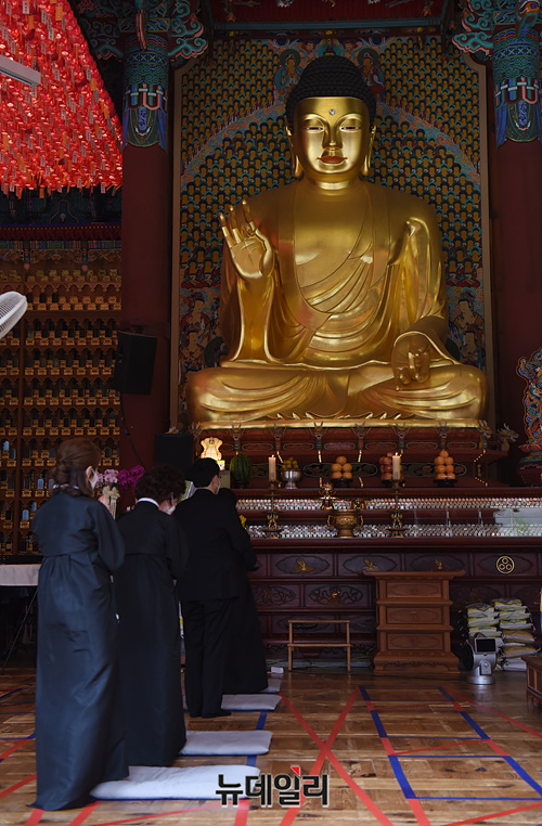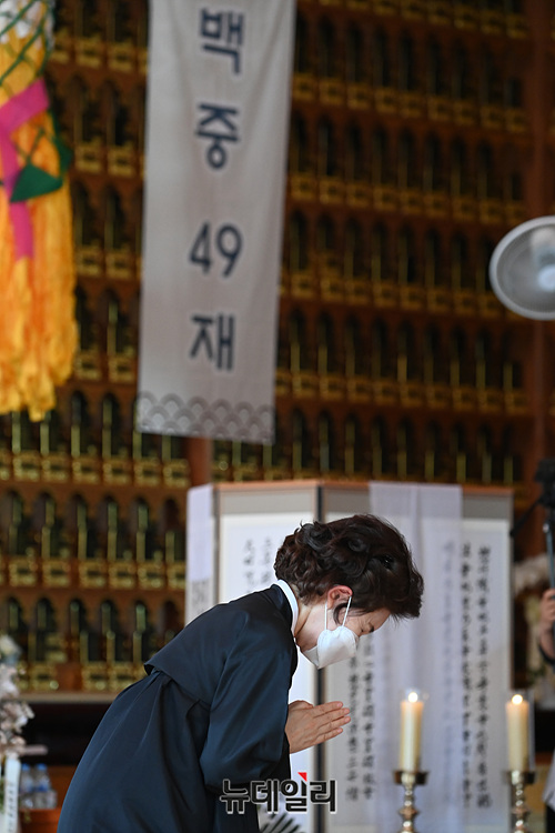 故 박원순 전 서울시장의 부인 강난희 여사, 아들 주신 씨, 딸 다인 씨가 26일 오후 서울 종로구 조계사에서 열린 박 전 시장 49재 막재에서 합장하고 있다.