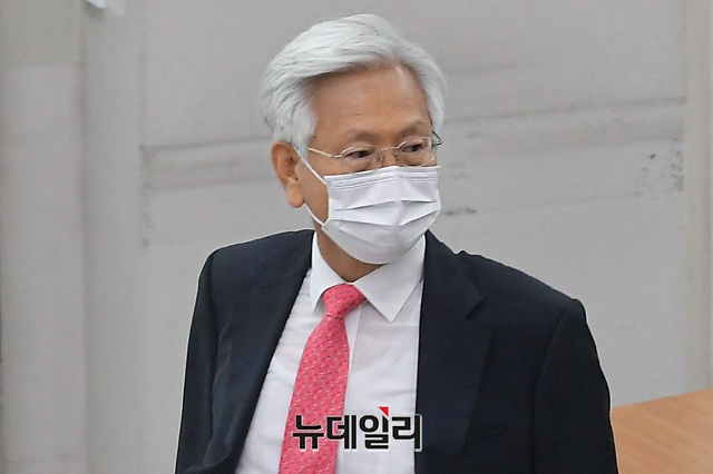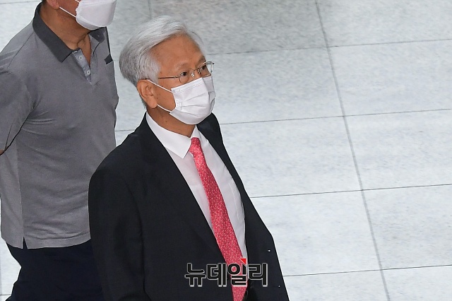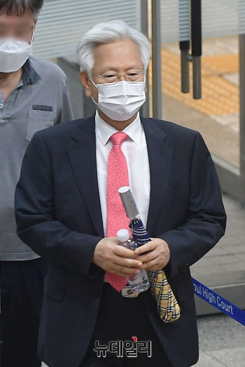 고영주 전 방송문화진흥회 이사장이 27일 오전 서울 서초구 서울중앙지법에서 열린 항소심 선고에 출석하고 있다.