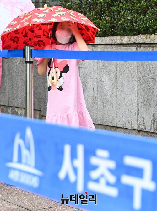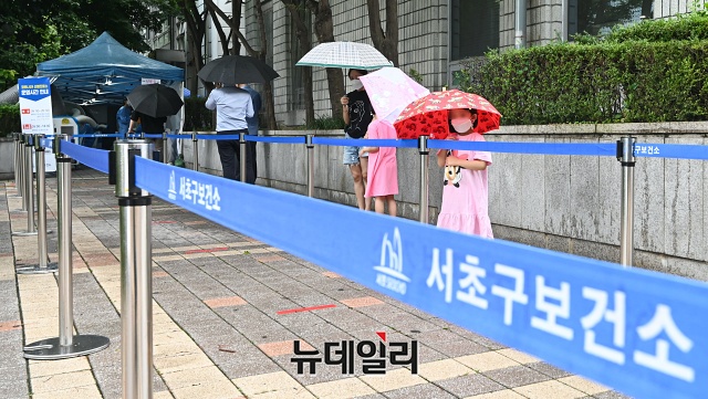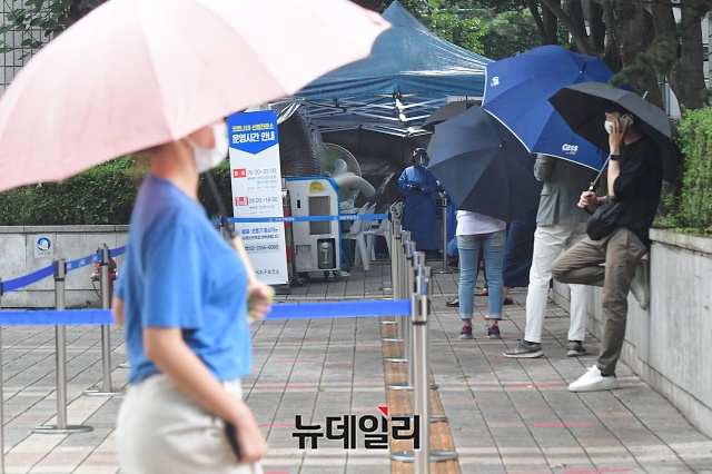서울 서초구보건소 선별진료소를 찾은 시민들이 27일 오후 '코로나19(중국 우한 폐렴)' 검사를 받기 위해 줄 서 있다. 태풍 '바비(Bavi)' 영향으로 코로나19 검사는 중단됐다가 이날 오후 1시부터 재개됐다.