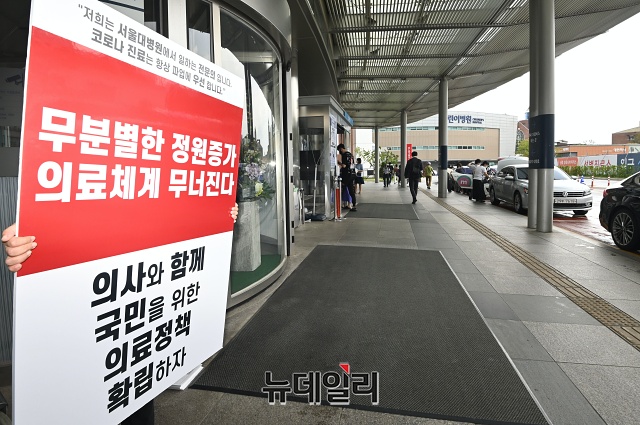 제2차 전국의사총파업 셋째날인 28일 오후 서울 종로구 서울대학교병원에서 한 전문의가 의과대학 정원확대 등 정부의 의료정책을 반대하는 손팻말을 들고 있다.