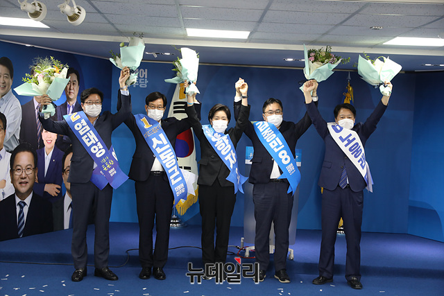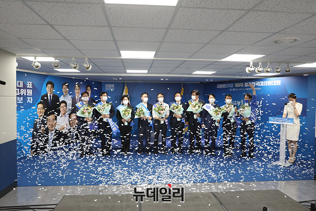 염태영(왼쪽부터)·신동근·양향자·김종민·노웅래 더불어민주당 최고위원 후보들이 29일 오후 서울 여의도 더불어민주당 당사에서 열린 '제4차 전국대의원대회'에서 최고위원으로 선출, 손을 맞잡고 기념촬영을 하고 있다.이날 민주당 신임 당대표가 된 이낙연 의원은 60.77%의 총득표율로 김부겸·박주민 후보를 제치고 승리했다.이번 전당대회는 '코로나19(중국 우한 폐렴)' 확산 방지를 위해 민주당 유튜브 채널 '씀TV'를 통해 온택트(온라인을 통한 비대면)방식으로 진행됐다. (사진=더불어민주당)