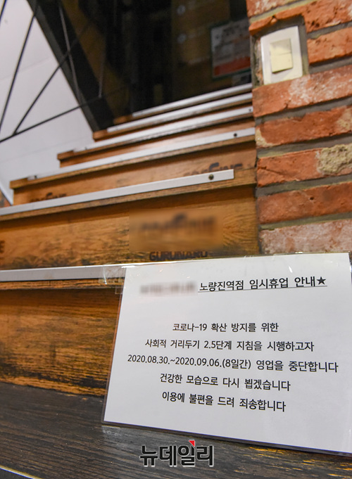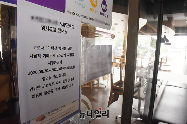 수도권에서 '사회적 거리두기 2.5단계'가 처음 시행된 30일 오후 서울 동작구 인근 프랜차이즈형 커피전문점이 임시휴업을 하고 있다.'코로나19(중국 우한 폐렴)' 확산 방지를 위해 30일부터 시작된 '사회적거리두기 2.5단계'는 다음 달 6일 밤 12시까지 8일간 적용된다.이로 인해 개인이 운영하는 소규모 카페를 제외한 프랜차이즈형 커피전문점은 영업시간과 관계없이 매장 내 음식이나 음료 섭취를 할 수 없고, 포장과 배달 주문만 가능하다. 치킨집·패스트푸드점 등과 같은 음식점과 제과점은 오후 9시부터 영업이 제한된다.수도권 학원은 인원과 관계없이 비대면 수업만 허용된다. 독서실·스터디카페 등에도 집합금지 명령이 내려졌다.윤태호 중수본 방역총괄반장은 지난 29일 브리핑에서 "우리는 수도권에서 코로나 확산을 잠재울 수 있는 마지막 방어선에 서 있다"며 "이번에 수도권의 확산세가 진정되지 않으면 우리 손에 남는 것은 3단계 격상이라는 극약처방밖에 없다"고 밝혔다.