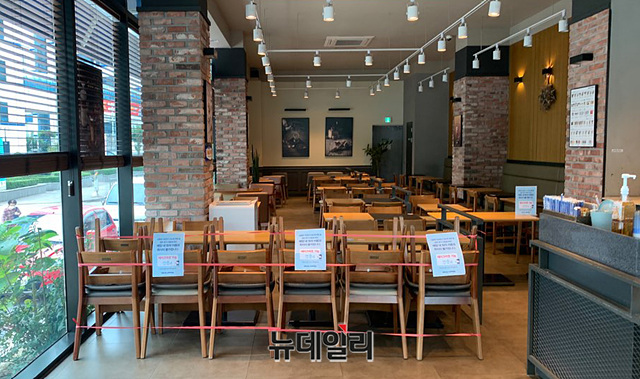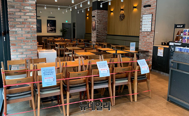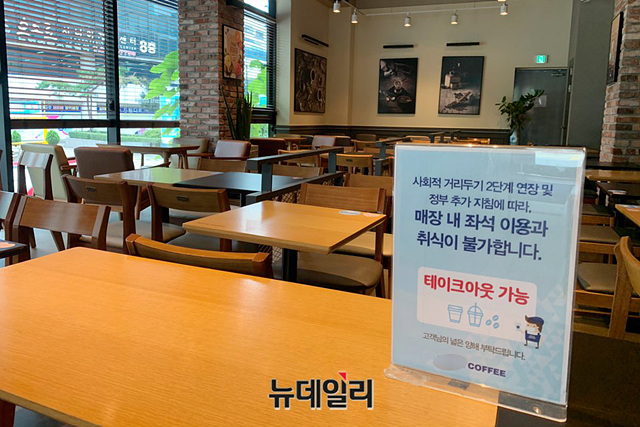 수도권에서 '사회적 거리두기 2.5단계'가 발효된 31일 오전 서울 구로구 한 프랜차이즈형 카페가 텅 비어있다. 점심시간이 임박함에도 불구하고 손님들은 카페를 찾지 않았다.정부는 30일부터 '코로나19(중국 우한 폐렴)' 확산 방지를 위해 '사회적거리두기 2.5단계'를 시행했다. '사회적거리두기 2.5단계'는 다음 달 6일 밤 12시까지 8일간 적용된다.이로 인해 수도권 프랜차이즈형 카페는 실내 이용이 불가하고 포장 및 배달만 가능하다. 개인이 운영하는 소규모 카페는 실내 이용이 가능하다.치킨집·패스트푸드점 등과 같은 음식점과 제과점은 오후 9시부터 영업이 제한된다. 헬스장과 당구장, 골프연습장 등 실내체육시설의 운영 역시 중단된다.