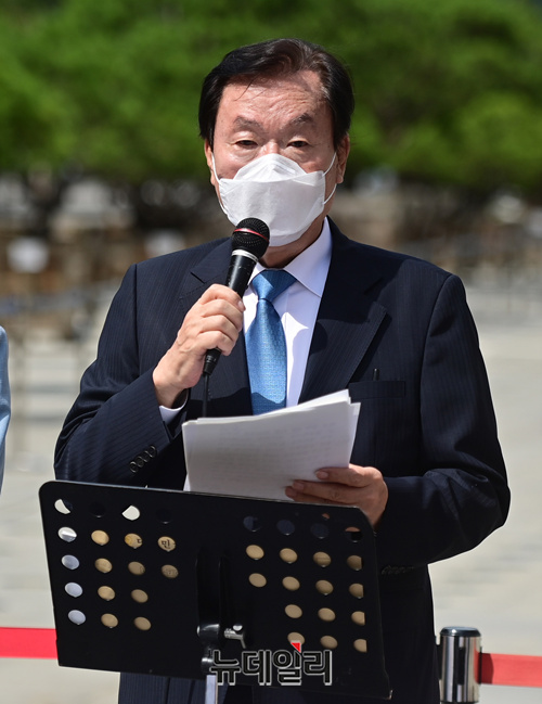 김경재 8.15광화문 국민대회 대회장이 31일 오후 서울 광화문 광장에서 8.15국민대회와 관련해 기자회견을 열고 문재인 정부에게 요구하는 사항을 발표하고 있다.