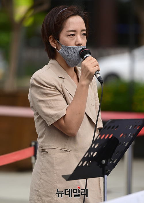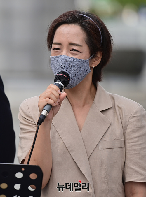 사랑제일교회 법률대리인 강연재 변호사가 31일 오후 서울 광화문 광장에서 열린 8.15국민대회 관련 기자회견에서 발언하고 있다.
