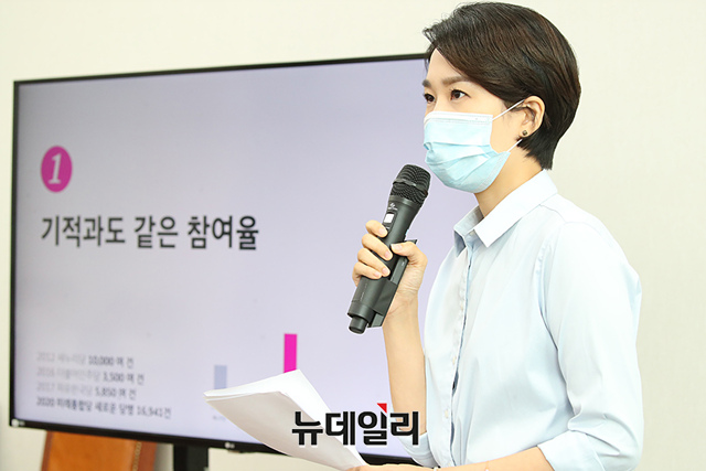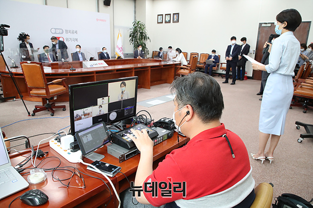 김수민 미래통합당 홍보본부장이 31일 오전 국회에서 열린 온라인 의원총회에서 정강정책과 당명 개정 관련 사항을 Youtube '오른소리'를 통해 당 소속 국회의원들에게 보고하고 있다. (사진=미래통합당)
