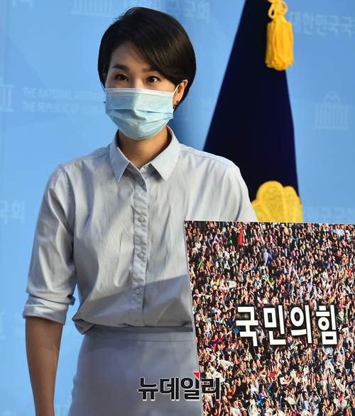김수민 미래통합당 홍보본부장이 31일 오후 국회 소통관에서 새로운 당명 '국민의힘' 개정 브리핑을 하고 있다.