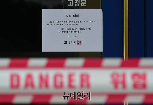 '코로나19(중국 우한 폐렴)' 확진자가 발생한 경기 고양시 일이삼요양원 입구에 시설폐쇄 안내문이 붙어 있다. 이 요양원은 9월 13일까지 요양원 전체를 코호트 격리됐다. (경기 고양=권창회 기자)