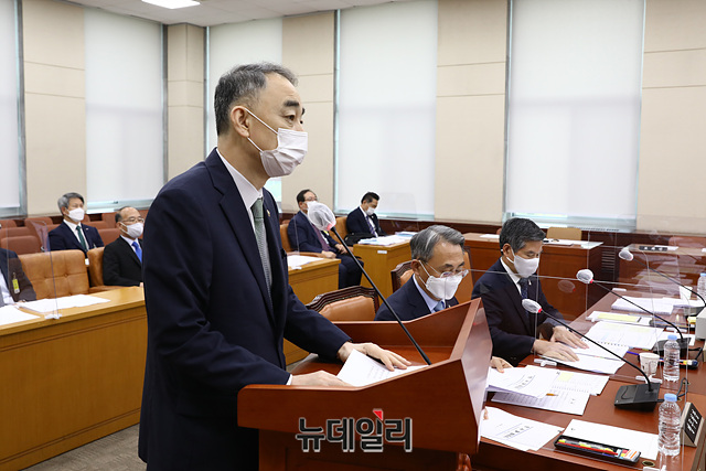 왕정홍 방위사업청장 1일 오전 국회에서 열린 국방위원회 전체회의에서 의원들의 질의에 답하고 있다. (사진=국회 사무처)
