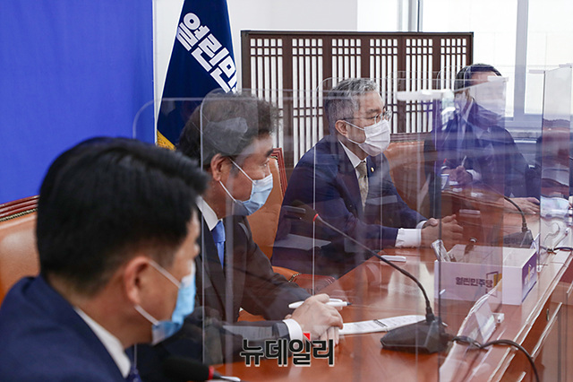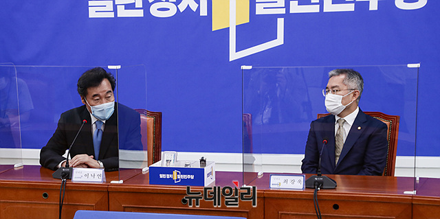 이낙연 더불어민주당 대표가 1일 오후 서울 여의도 국회에서 최강욱 열린민주당 대표를 예방하고 환담을 나누고 있다. (사진=더불어민주당)