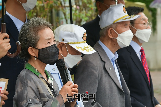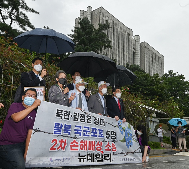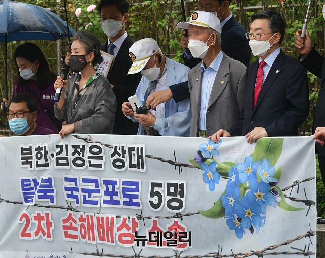 박선영 사단법인 물망초 이사장이 2일 오전 서울 서초구 서울중앙지법 앞에서 열린 '탈북 국군포로 5명, 북한·김정은 상대 2차 손해배상 소송 기자회견'에서 발언을 하고 있다.박 이사장은 "탈북 국군포로 5명이 50년 이상의 불법억류와 노예같은 강제 탄광 노동에 대한 2차 손해배상 소송을 제기한다"며 "원고들의 연령이 평균 90세가 넘어 이분들이 생존해 계신동안 재판결과가 나오기를 바란다. 1차 소송에 법원이 인정한 범위 내에서 진행할것"이라고 밝혔다.앞서 지난달에 탈북국군포로 2명이 북한과 김정은을 상대로 손해배상 소송을 제기해 승소했다.