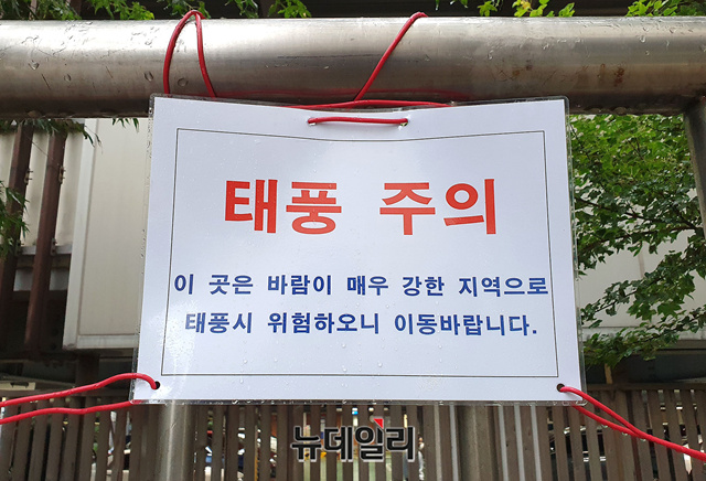 제9호 태풍 마이삭의 영향권에 든 2일 오후 서울 강남구의 한 건물에 '태풍 주의' 안내판이 내걸렸다. 기상청은 이날 오후 7시를 기해 서울전역에 호우주의보를 발령했다. 이어 태풍이 상륙하는 3일 새벽부터 시간당 50mm 내외의 강한 비가 올것으로 전망했다.