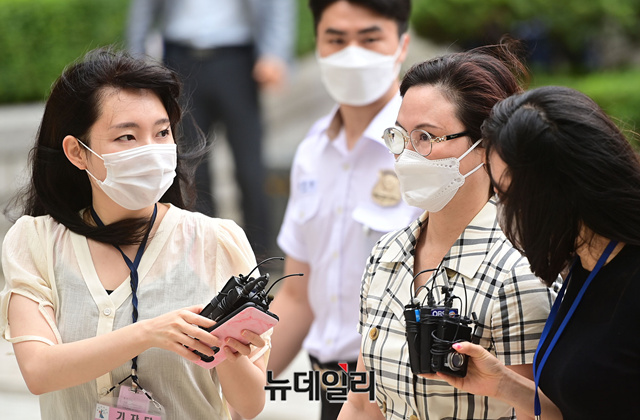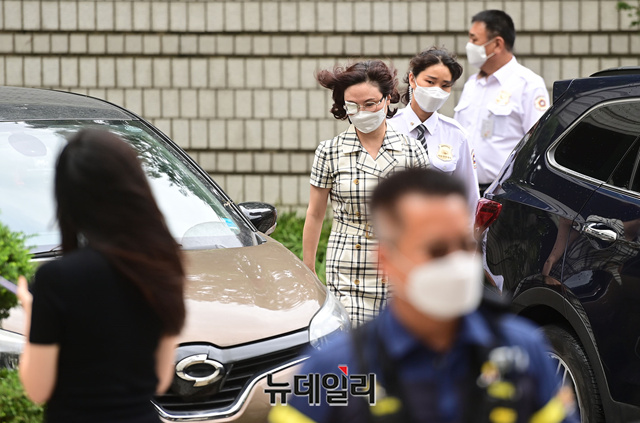 정경심 동양대 교수가 3일 오전 서울 서초구 서울중앙지법에서 열린 공판에 출석하고 있다. 이날 재판에는 조국 전 법무부 장관이 증인으로 출석한다. 조 전 장관은 증인보호신청으로 언론에 모습을 드러내지 않았다.