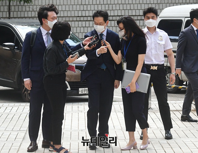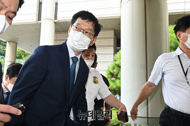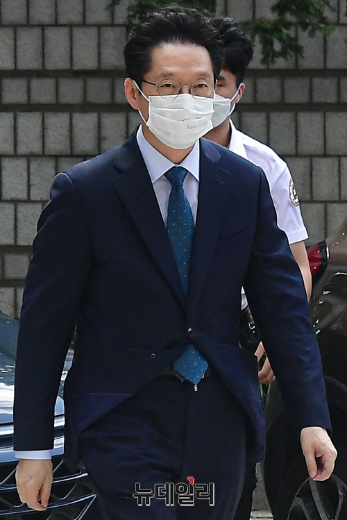 '드루킹 댓글 조작' 혐의로 1심에서 실형을 선고 받은 김경수 경남지사가 3일 오후 서울 서초구 고등법원에서 열린 항소심 공판에 출석하고 있다. 8월 17일 예정된 공판은 정부의 임시공휴일 지정으로 연기됐다.