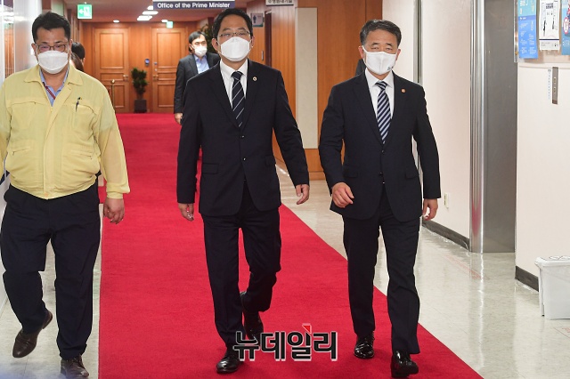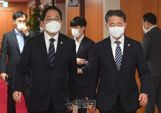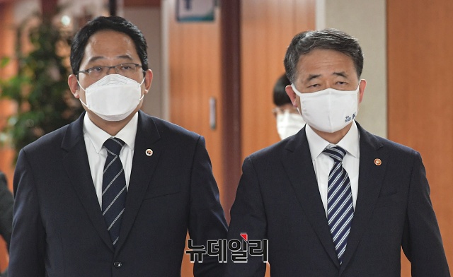 박능후 보건복지부 장관과 최대집 대한의사협회 회장이 4일 오후 서울 종로구 정부서울청사에서 의·정 협의체 구성 합의서 체결을 위해 회의실로 들어서고 있다.