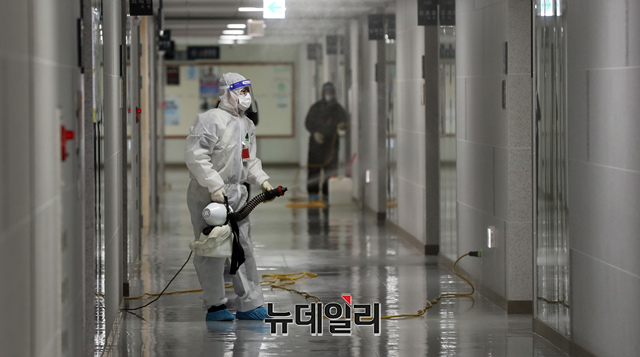 국회의사당에 세 번째 '코로나19 (중국 우한 폐렴)' 환자가 발생한 7일 오후 국회 사무처가 본청과 소통관을 일부 폐쇄하고 긴급 방역을 실시하고 있다. (사진=국회사무처)