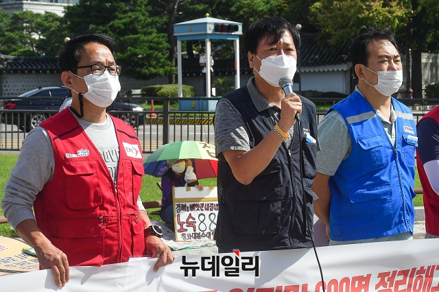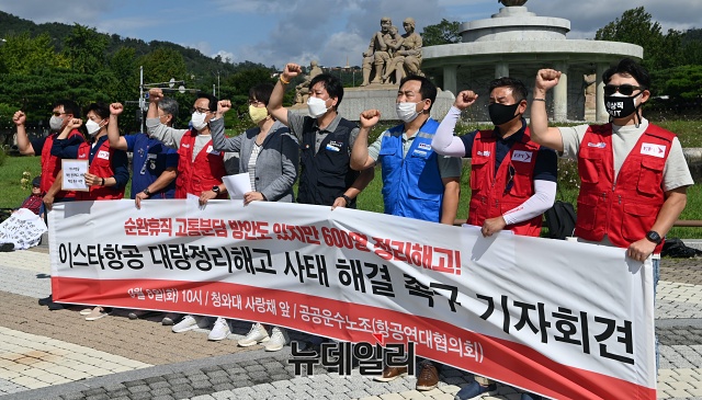 공공운수노조, 이스타항공조종사노조가 8일 오전 서울 종로구 청와대 앞 분수대에서 열린 '이스타항공 대량정리해고 통보 규탄 기자회견'에서 구호를 외치고 있다.