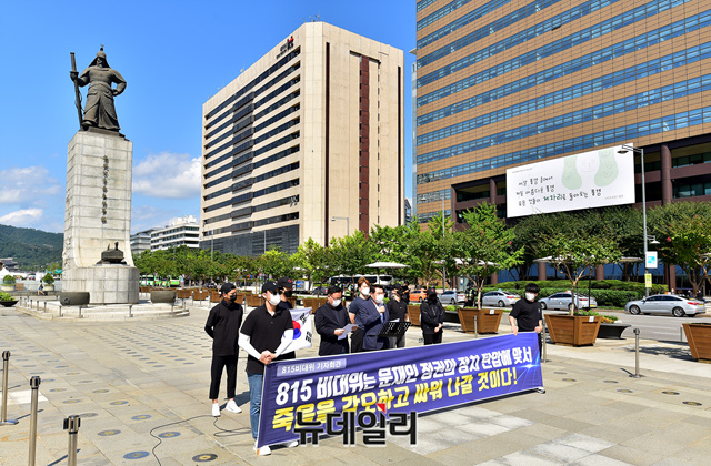 8.15 집회 참가자 국민비상대책위원회가 8일 오후 서울 광화문광장에서 기자회견을 열고 "문재인 정권의 정치탄압에 맞서 죽음을 각오하고 싸워 나갈것"이라고 밝혔다.