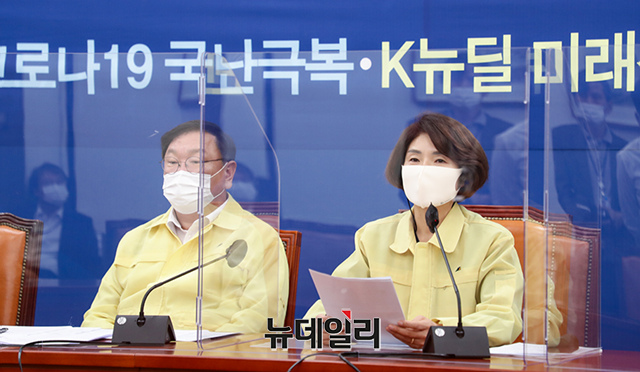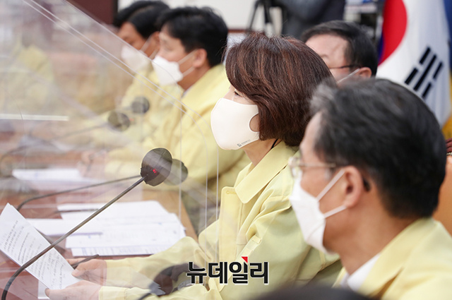 한정애 더불어민주당 정책위의장 10일 오전 국회에서 열린 정책조정회의에 참석하여 모두발언을 하고 있다.(사진=더불어민주당)