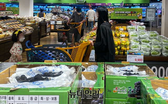 추석 명절을 앞둔 10일 오후 서울 시내의 한 마트에 과일, 육류 등 추석 선물세트 모형이 전시돼 있다.