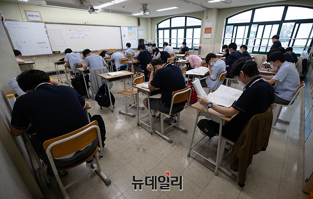 2021학년도 수능 9월 모의평가가 실시된 16일 오전 서울 용산구 용산고등학교에서 고3 수험생들이 시험지를 배부받고 있다.