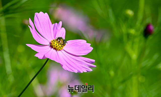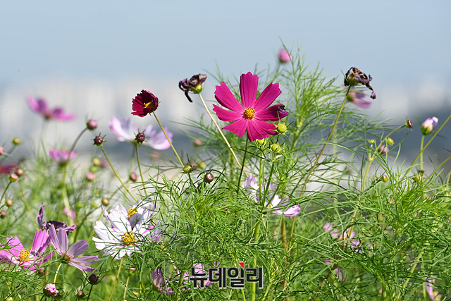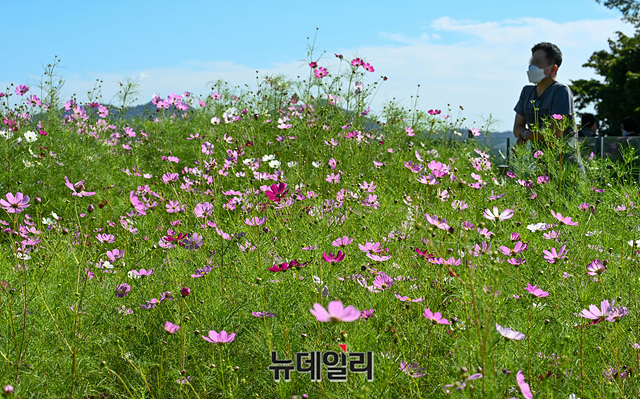 청명한 하늘에 확연한 가을 날씨인 18일 오전 서울 마포구 하늘공원에 핀 코스모스 사이로 시민들이 여유를 즐기고 있다. 이날 전국의 낮 최고 기온은 22~26도를 기록하면서 어제와 비슷하거나 더 선선한 날씨가 될 것으로 보인다. 주말까지 대체로 맑은 가을 날씨가 이어질 전망이다.