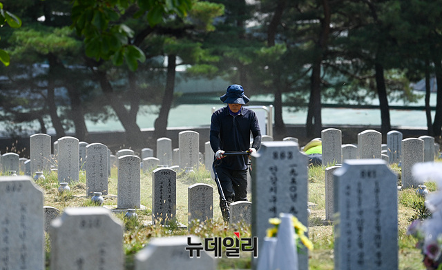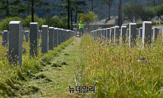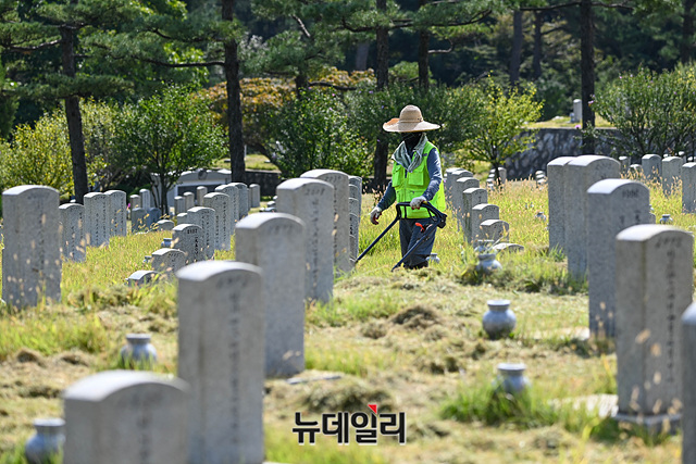 국가보훈처가 '코로나19(중국 우한 폐렴)' 확산 방지를 위해 추석 연휴 기간 동안 전국 11개 국립묘지가 문을 닫는다고 밝힌 21일 오전 서울 동작구 국립서울현충원에서 관계자가 벌초를 하고 있다.현충원(서울·대전), 호국원(영천·임실·이천·산청·괴산), 민주묘지(3·15/4·19/5·18), 신암선열공원 등이 30일부터 다음달 4일까지 문을 닫는다. 대신 '온라인 참배' 형식의 대체 서비스를 제공하기로 했다.추석 연휴 기간 동안 국립묘지 야외묘역, 봉안당, 위패봉안소 등의 출입이 통제된다. 실내 편의시설과 셔틀버스 운행도 일시 중단한다.야외묘역의 현장 참배에 대해서는 안장되신 분의 기일 등 불가피한 경우에 한하여 사전예약을 받아, 제한적으로 허용할 예정이다.