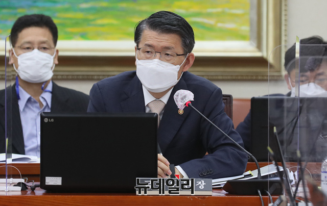 은성수 금융위원장이 21일 오전 국회에서 열린 정무위원회 전체회의에 참석해 의원들의 질문에 답하고 있다. (사진=국회사무처)
