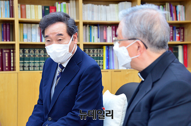이낙연 더불어민주당 대표가 21일 오전 서울 광진구 한국천주교주교회의를 예방해 주교회의 의장인 김희중 대주교와 환담을 나누고 있다. (사진=더불어민주당)