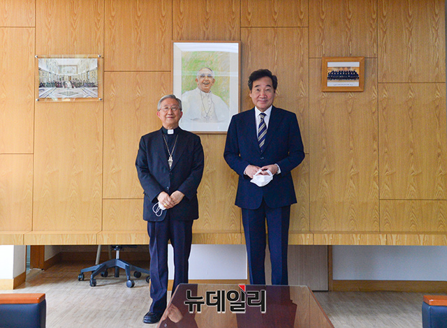 이낙연 더불어민주당 대표가 21일 오전 서울 광진구 한국천주교주교회의를 예방해 주교회의 의장인 김희중 대주교와 기념사진을 촬영하고 있다. (사진=더불어민주당)