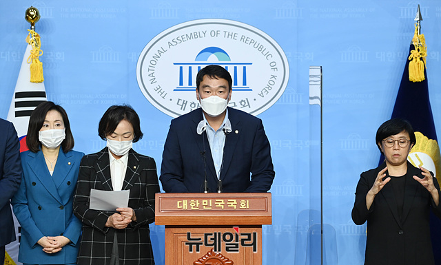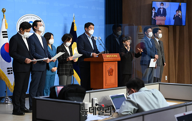 정희용 국민의힘 중앙재해대책위원장 등 위원들이 21일 오후 국회 소통관 기자회견장에서 '집중호우로 인한 수해 피해 책임규명을 위한 국정조사 추진 촉구 기자회견'을 갖고 있다.이들은 "지난 18일 수해 피해지역 재방문을 통해 피해지역 주민들 모두가 한목소리로 이번 수해는 자연재해가 아닌 인재라며, 철저한 원인 규명과 재발 방지대책을 요구했다"고 말했다.이어 △피해 원인 규명을 위한 국회 국정조사 추진 △책임있는 관계기관에 대한 감사원 감사 추진 △정부 재난지원금 현실화 및 주택침수 구호비 1,000만 원까지 인상 △특별재난지역에 조속한 재난지원금 집행 △이상기후에 대비한 재난·재해 대응 시스템 마련 등을 요구했다.